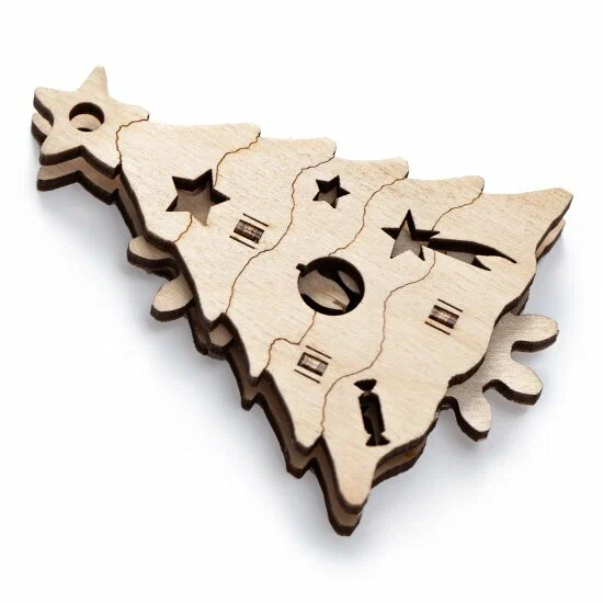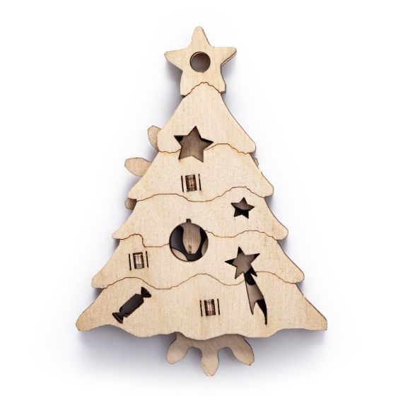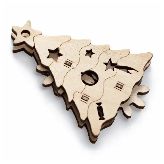 В собранном виде деревянная игрушка занимает минимум места и легко разместится на новогодней елке или на праздничном столе. Сборка не требует специальных инструментов и собирается по простой инструкции. Новогоднюю игрушку можно раскрасить акриловыми красками, использовать технику «Декупаж» и другие виды декоративного творчества. Экологически чистый конструктор елка бережно отшлифован и безопасен.