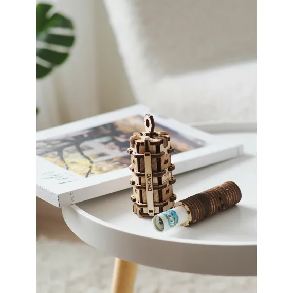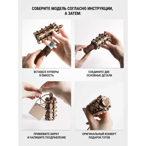 Подарочная коробка для денег представляет собой колбу, куда можно положить свернутые купюры или секретное послание. Нужно догадаться как его открыть, вращая по лабиринту колбу, в которой лежат купюры. В комплекте есть ярлычок, на котором можно написать имя или пожелание, и нить, чтобы привязать бирку к изделию.