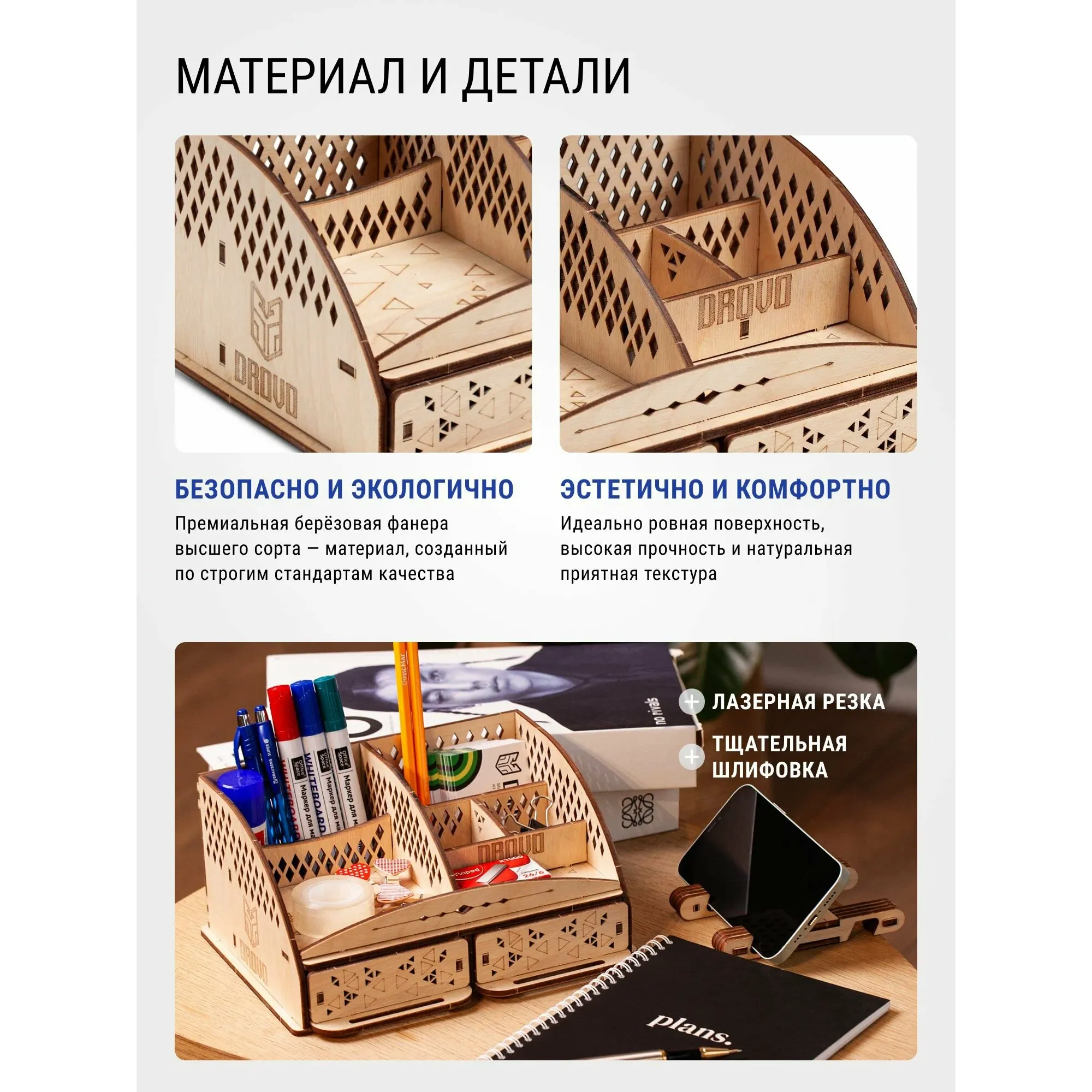 Деревянный конструктор от DROVO — элегантный и функциональный набор из 24 деталей, из которых создаётся вместительный настольный органайзер. В собранном виде конструктор превращается в подставку для ручек, карандашей и мелочей, с двумя выдвижными ящиками. Сборная модель - не просто предмет декора, а функциональное дополнение рабочего места.