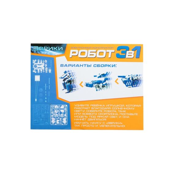 Представляем вашему вниманию занимательный набор для опытов 3 в 1 серии «Эврики: Прогрессивные технологии». Комплект позволит сконструировать не одну игрушку, а 3 различные модели: скорпиона, танка или робота. Создайте своего персонажа и наслаждайтесь игрой!