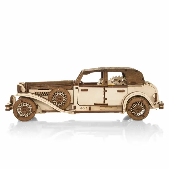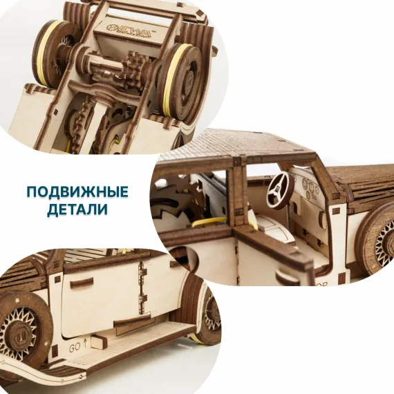 Деревянная сборная модель автомобиля оснащена как пружинным мотором, так и инерционным механизмом, которые приводят его в движение после сборки. Его можно завести с помощью ключа, который помещается в багажнике, а также путем оттяжки автомобиля назад. Ретро-автомобиль из дерева прекрасно детализирован, в нем открываются двери, капот и багажник.