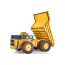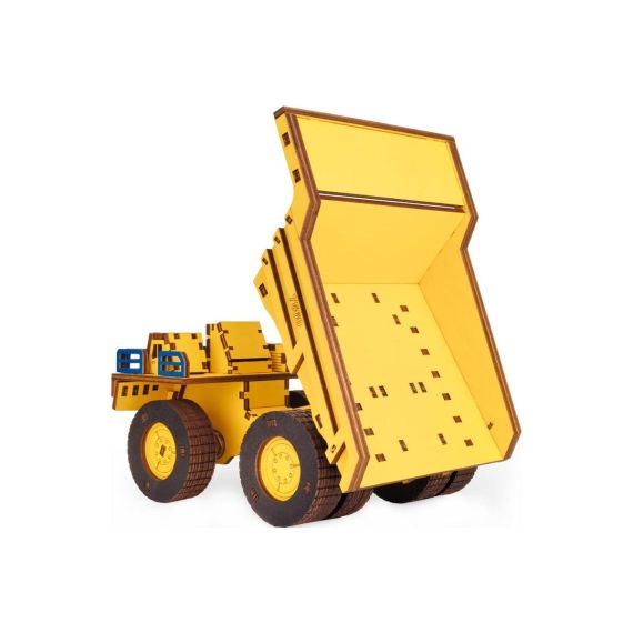 Цветная сборная механическая деревянная модель спецтехники с элементами интерактивности: крутящимися колёсами и поднимающимся кузовом.