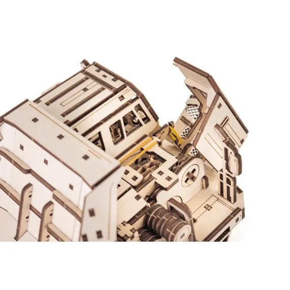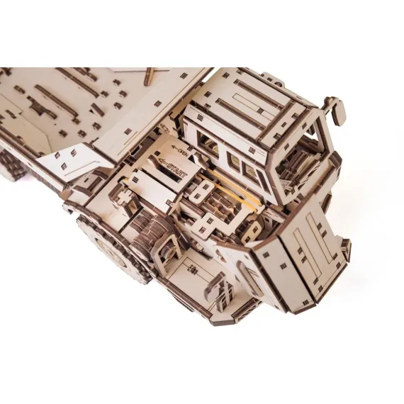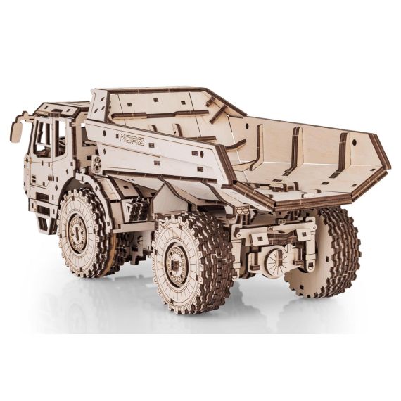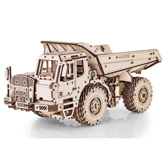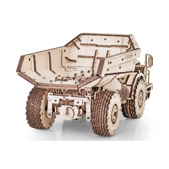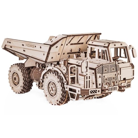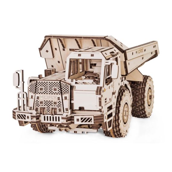 Сборная механическая деревянная коллекционная модель — точная детализированная копия белорусского самосвала повышенной проходимости с высокой грузоподъёмностью, созданная в сотрудничестве с заводом БелАЗ и работающая на пружинном моторе.