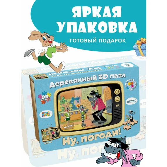 Деревянный пазл «Ну, Погоди!» размера 29х25 см из коллекции Союзмультфильм – это захватывающий способ провести время с друзьями и семьей, вспоминая советские мультики.