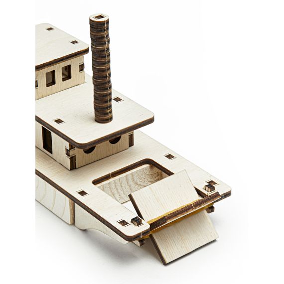 Собранный кораблик оснащен резиномотором, который позволяет ему плавать на воде. Просто запустите винт, и ваш малыш сможет наблюдать, как его собственноручно собранный пароход бороздит просторы ванной или бассейна.
