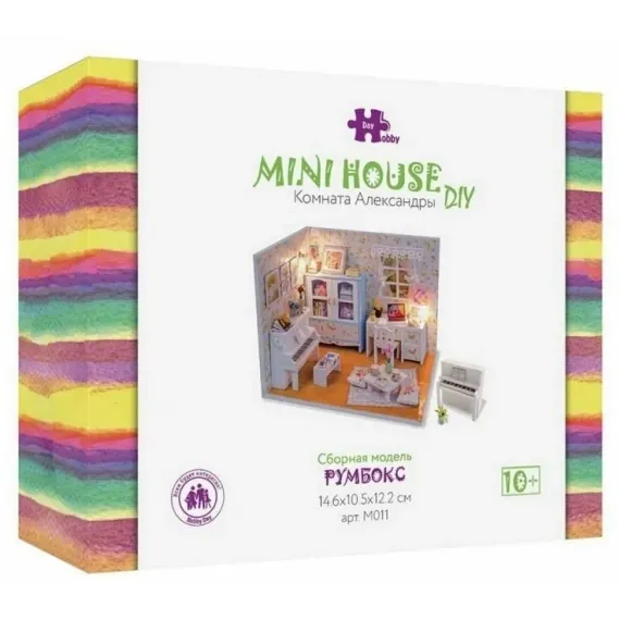 Румбокс Интерьерный конструктор Hobby Day DIY MiniHouse, от официального дистрибьютора, полностью русифицированный. Для успешной сборки необходима русскоязычная инструкция. Проверяйте наличие логотипа HOBBY DAY на коробках. Остерегайтесь подделок! Румбокс - это готовый набор для творчества, внутри которого Вы найдете все необходимое, чтобы воссоздать собственными руками кукольный домик высокой детализации. Все детали выполнены из безопасных материалов и необыкновенно реалистичны. Diy Mini House станет действительно прекрасным подарком. Это интересное времяпрепровождение для детей от 10 до 14 лет. Собранный румбокс может стать как необычным элементом декора с подсветкой, так и домиком для кукол размером 5-7 см. Материал конструктора: дерево, текстиль, пластик, металл. Комплектация: детали изделия, русская инструкция, клей, светодиоды (комплект для освещения с выключателем). Обращаем внимание, что пылезащитный купол не входит в состав данного набора.