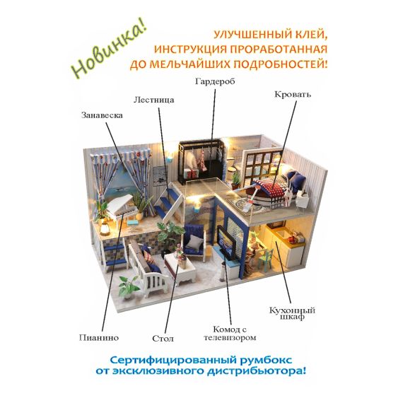 Румбокс - это готовый интерьерный конструктор для творчества от официального дистрибьютера HOBBY DAY. Внутри набора Вы найдете все необходимое, чтобы воссоздать собственными руками кукольный интерьер в миниатюре. Для Вашего удобства разработана новая пошаговая инструкция. Во всех наборах новый усиленный клей без запаха. Светодиодная подсветка. Все детали выполнены из безопасных материалов и необыкновенно реалистичны. Это занимательное увлечение способствует развитию творческих способностей, усидчивости, совместному времяпрепровождению детей и их родителей. Набор подходит для детей в возрасте от 10 до 14 лет, для детей более младшего возраста возможно понадобится помощь взрослого человека. Собранная модель может стать домиком для куколок 5-7 см, необычным предметом интерьера или ночником.