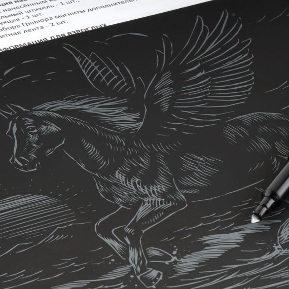 Техника выполнения гравюры достаточно проста и не представляет сложности для ребенка, ножом-штихелем нужно процарапать контур рисунка, нанесенный на лист-основу. Результатом работы будет чудесная гравюра с изображением мифической лошади Пегаса.