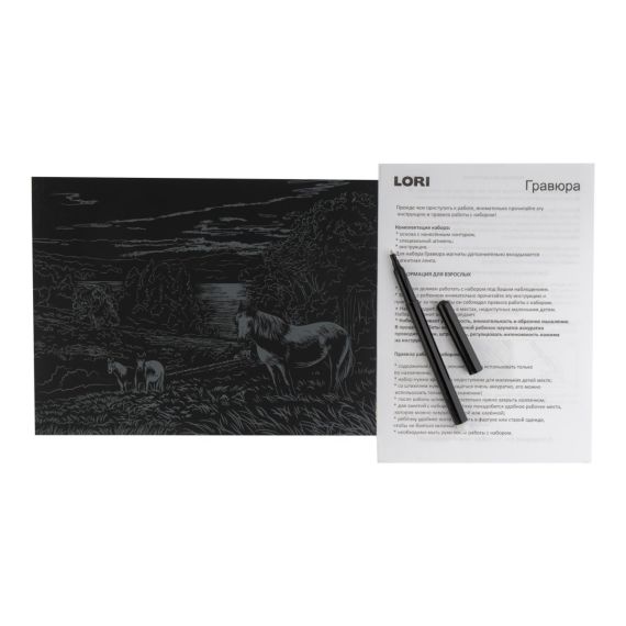 Гравюра представляет собой многослойное панно, покрытое чёрной краской, на которое нанесён контур рисунка. Техника создания гравюры увлекательна и достаточно проста. Необходимо лишь взять штихель – особый скребок, входящий в состав набора, и процарапать рисунок гравюры. Работа с гравюрой развивает усидчивость, внимательность и образное мышление.
