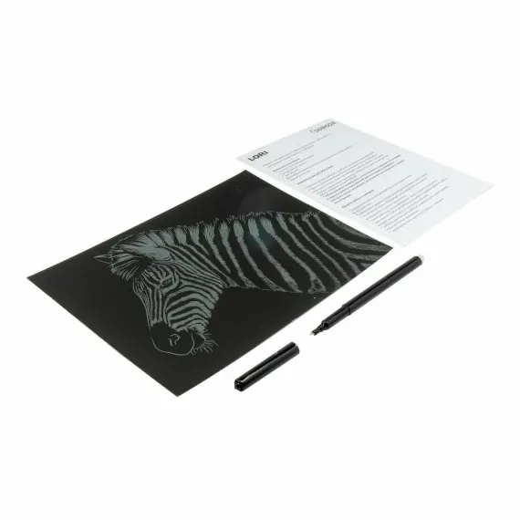 Гравюра представляет собой многослойное панно, покрытое чёрной краской, на которое нанесён контур рисунка. Техника создания гравюры увлекательна и достаточно проста. Необходимо лишь взять штихель – особый скребок, входящий в состав набора, и процарапать рисунок гравюры. Работа с гравюрой развивает усидчивость, внимательность и образное мышление.