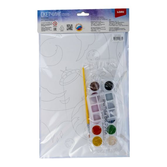 Набор для творчества «Скетчинг» включает в себя три основы с контуром будущего рисунка, акварельные краски 12 цветов, кисть, палитру и инструкцию.