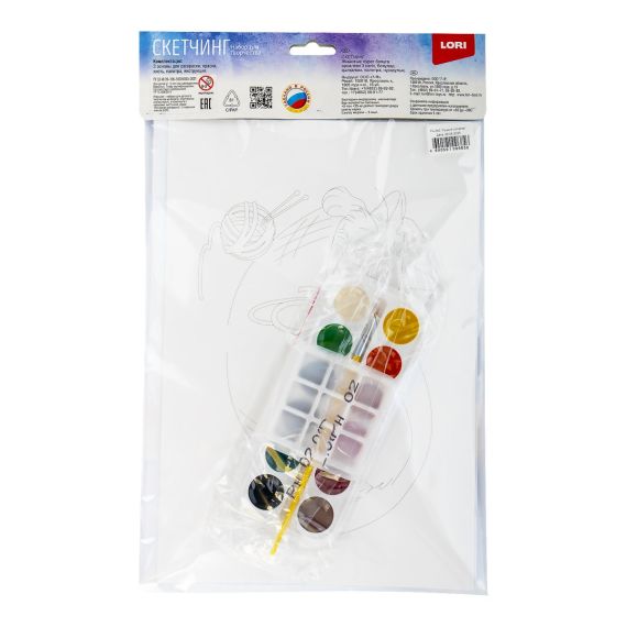 Набор для творчества «Скетчинг» включает в себя три основы с контуром будущего рисунка, акварельные краски 12 цветов, кисть, палитру и инструкцию.