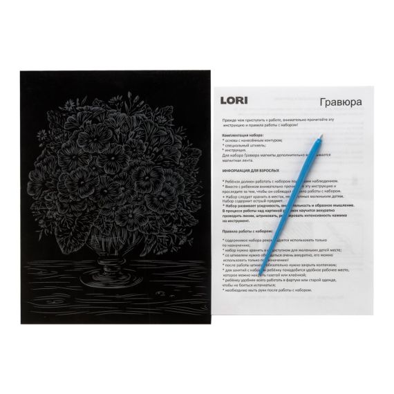 Комплектация: Основа с нанесенным контуром, специальный штихель, инструкция.