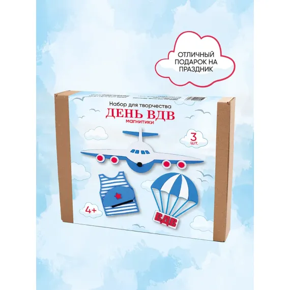 Этот подарочный набор для творчества от бренда "Санта Лючия" станет идеальным подарком для мальчиков и девочек, а также полезным материалом для занятий творчеством. Всего в наборе три магнита в военной тематике: Самолет, Тельняшка с беретом ВДВ и Парашют