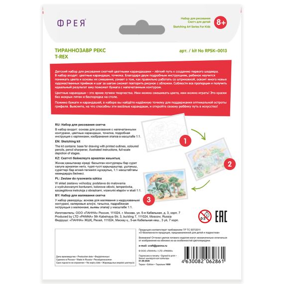 В набор входит: основа для рисования с напечатанными контурами, цветные карандаши, точилка, подробная инструкция с картинками, изображения этапов в масштабе 1:1
