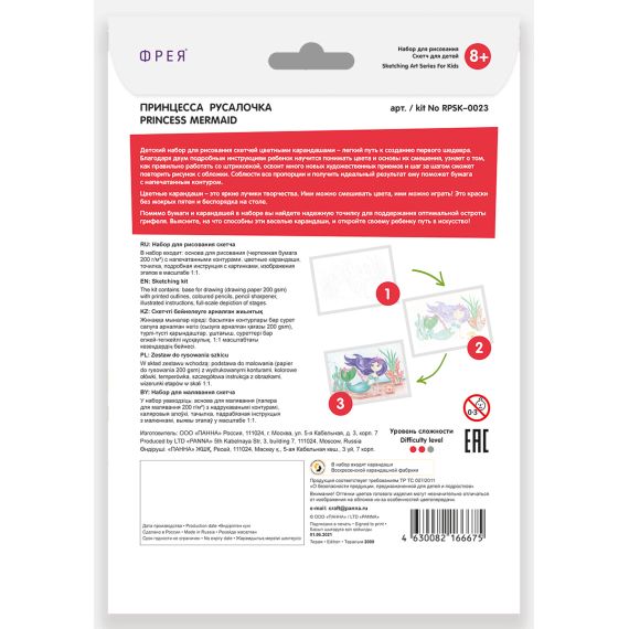 В набор входит: основа для рисования с напечатанными контурами, цветные карандаши, точилка, подробная инструкция с картинками, изображения этапов в масштабе 1:1