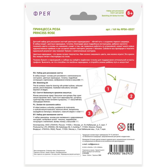 В набор входит: основа для рисования с напечатанными контурами, цветные карандаши, точилка, подробная инструкция с картинками, изображения этапов в масштабе 1:1