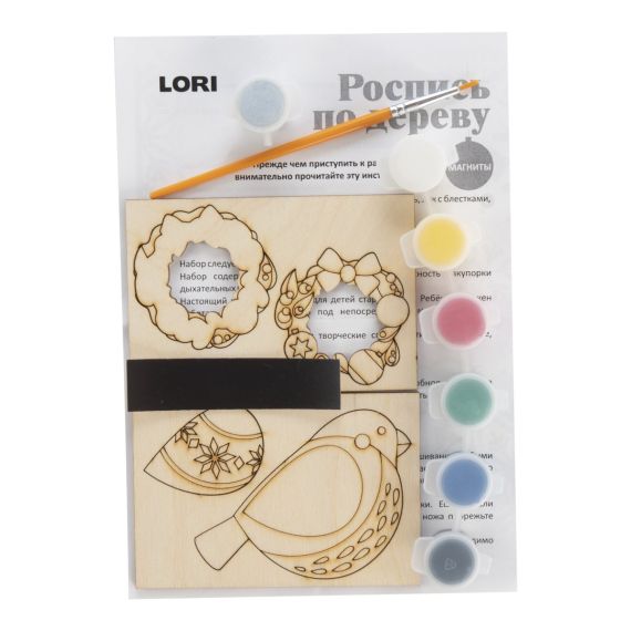 Комплектация: Деревянные заготовки, краски, лак с блестками, кисть, магнитная лента, инструкция.