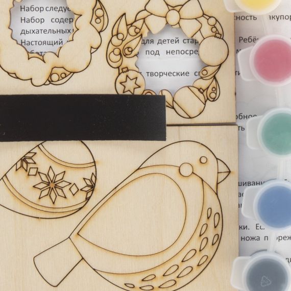 В комплектацию набора входят деревянные заготовки, которые необходимо расписать акриловыми красками и добавить сияния блестками, а затем приклеить магнитную ленту и повесить на холодильник или другую подходящую поверхность.