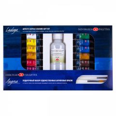 Палитра акриловых красок «Ладога»: 51 цвет, в т.ч. 13 цветов «металлик», тубы объёмом 46 мл, банки объёмом 100 мл, 220 мл и 500 мл.