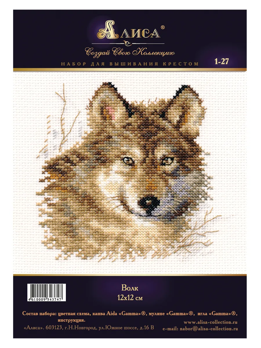 Набор для вышивания "Волк". Размер готовой вышивки 12х12 см -14 цветов. В набор входит: Канва Aida 14 белая, Мулине Гамма 100% хлопок, разобранное на органайзере, 2 иглы, инструкция, символьная схема со слабой цветовой тонировкой.