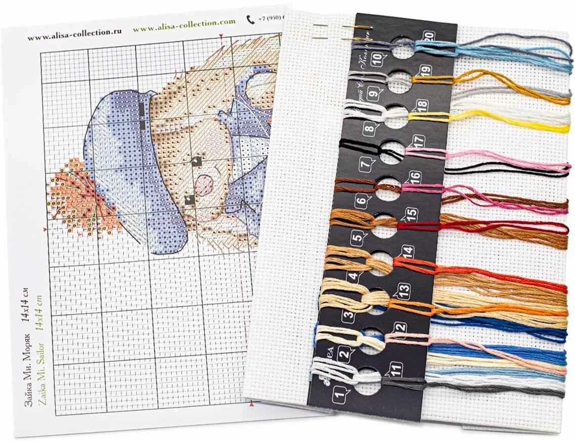 Набор для вышивания "Зайка Ми-Моряк", 14х14 см. Это замечательное приобретение для всех девочек и женщин, которые увлекаются творчеством и обожают пробовать что-то новое. Если вы давно занимаетесь вышивкой или же только собираетесь осваивать это хобби - приобретайте наш комплект и создавайте шедевры своими руками! В состав набора входит канва без нанесенного рисунка Aida "Gamma" из 100 % хлопка. Материал достаточно плотный и жесткий, край изделия не пушится и сохраняет свою целостность - рукоделию не требуются пяльца, поэтому можно вполне обойтись и без них. Нити мулине Гамма отличаются особой прочностью и ярким насыщенным цветом, а игла достаточно острая и тонкая, что позволит ей без труда попасть в отверстие и создать идеальные крестики в канве Аида. Также в наборе есть цветная символьная схема и инструкция на русском языке.