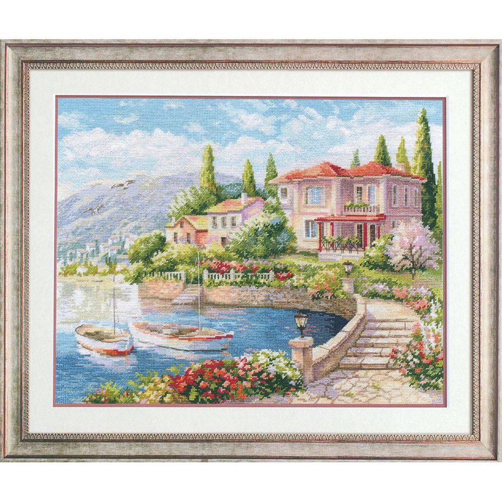 Набор для вышивания "Утро на побережье". Размер готовой вышивки 38х31 см - 43 цветов. В набор входит: Канва Aida 16 белая, Мулине Гамма 100% хлопок, разобранное на органайзере, 2 иголки, инструкция, символьная схема со слабой цветовой тонировкой.