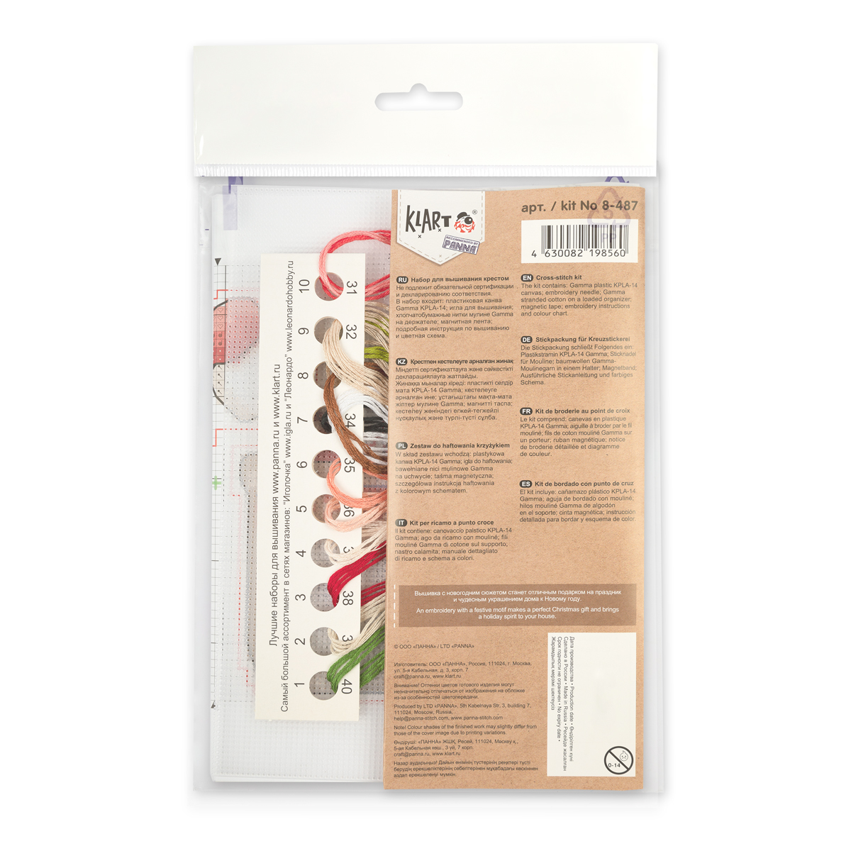 В набор для вышивания Klart входит: пластиковая канва Gamma, хлопчатобумажные нитки мулине Gamma на держателе, игла для вышивания Gamma, магнит, инструкция по вышиванию.