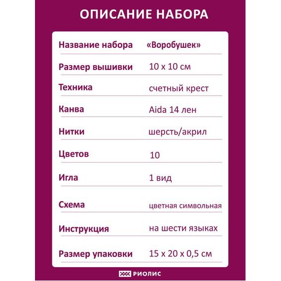 Выбирая набор для вышивания Riolis, вы получаете гарантию качества и возможность создать нечто особенное. Попробуйте свои силы в вышивании и погрузитесь в мир творчества с набором Воробушек!