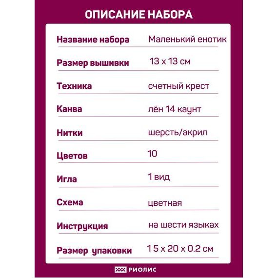 Набор Riolis "Маленький енотик" идеально подходит для творческих людей всех возрастов. Независимо от вашего опыта в вышивании, вы сможете создать красивую и аккуратную работу, которая будет радовать вас долгое время. Начните свое путешествие в мир вышивания с этим очаровательным набором и почувствуйте себя настоящим художником!