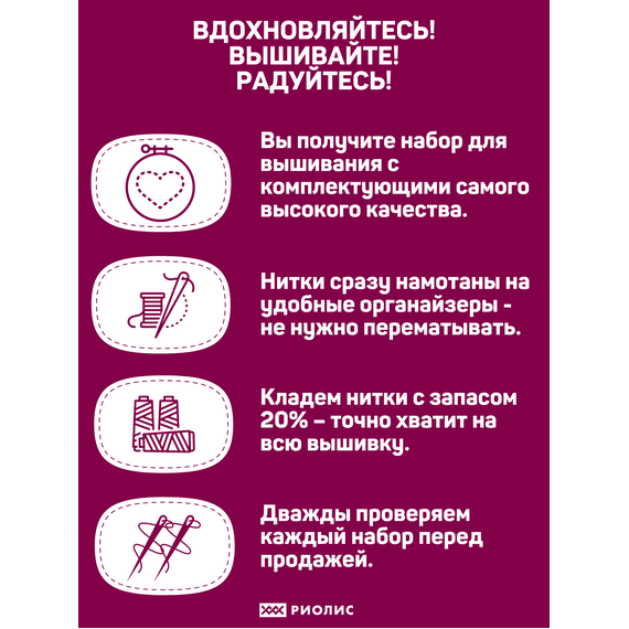 Набор включает в себя все необходимое для комфортной и приятной работы: высококачественную канву размером 13х13см, мулине из 100% хлопка, иглу и подробную инструкцию, которая поможет даже начинающим мастерам легко освоить технику вышивания крестом. Каждый элемент набора тщательно продуман, чтобы обеспечить отличное качество и долговечность готового изделия.