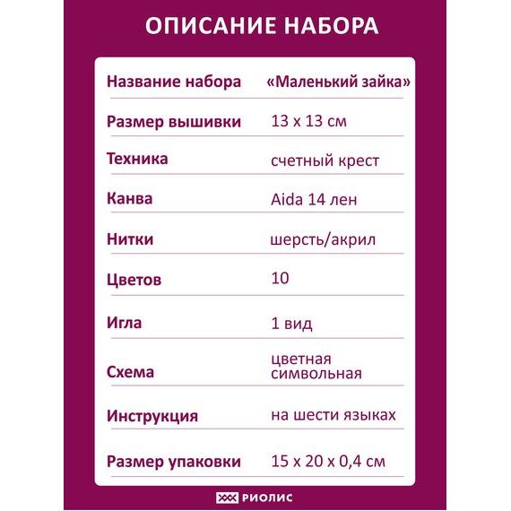 Набор Riolis "Маленький зайка" идеально подходит для творческих людей всех возрастов. Независимо от вашего опыта в вышивании, вы сможете создать красивую и аккуратную работу, которая будет радовать вас долгое время. Начните свое путешествие в мир вышивания с этим очаровательным набором и почувствуйте себя настоящим художником!