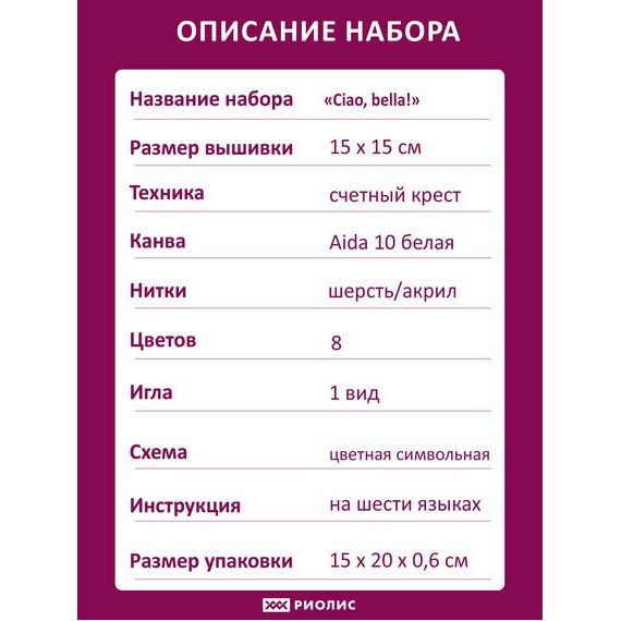 Набор для вышивания крестом " Ciao, bella! " укомплектован: · Канва белая, без рисунка 10 каунта · Нити на плашках шерсть / акрил · Количество цветов – 8 оттенков · Размер готовой работы 15*15 см. · Игла для вышивания · Цветная символьная и электронная схема · Подробная инструкция Вышивка выполняется в технике стежок, счётный крест, смешанные цвета. Продажа от производителя! Продукция бренда РИОЛИС - оптимальное решение для тех, кто ищет изделие высокого качества, любит творчество и хочет попробовать себя. Благодаря нашим наборам творчество доступно каждому! Просто выберите дизайн по душе и становитесь его создателем. От маленьких уникальных сюжетов до больших картин и репродукций. РИОЛИС - ваш идеальный выбор!