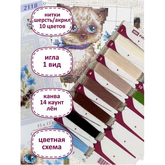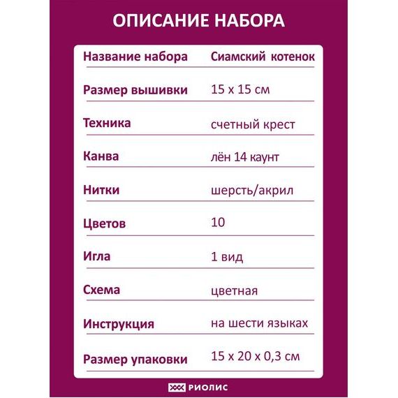 Продажа от производителя! В наборе для вышивания крестом "Сиамский котенок" используются техники: счётный крест, стежок, смешанные цвета. В наборы Риолис входит все необходимое для творческого процесса. Мы комплектуем наборы с запасом ниток в 20% от необходимого количества каждого цвета. Благодаря нашим наборам творчество доступно каждому! Просто выберите дизайн по душе и становитесь его создателем. Размер готовой работы: 15х15 см. В набор входит: цветная символьная схема, электронная схема, канва для вышивания без нанесенного рисунка 14 хлопок/лен, нитки шерсть/акрил (10 цветов) на плашке(ах), игла, инструкция.