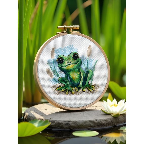 Вы сможете создать уникальное и неповторимое украшение комнаты, которое будет напоминать о ваших талантах и ручной работе. Вышивка крестиком - прекрасный подарок маме, бабушке, сестре, подруге на Новый Год, день рождения, новоселье и 8 марта. На вышивке изображен очаровательный маленький лягушонок с выразительными большими глазами. Вышивка отлично подойдет для украшения детской одежды или салфетки.