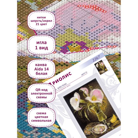 Вышивка крестиком в наборе включает в себя все необходимое для создания красивой картины: канву Aida 14 ct белую, мулине (шерсть/акрил), иглу, бумажную цвето-символьную схему, QR-код электронной схемы, инструкцию. Количество цветов составляет 21, что позволяет создать яркую и насыщенную картину.