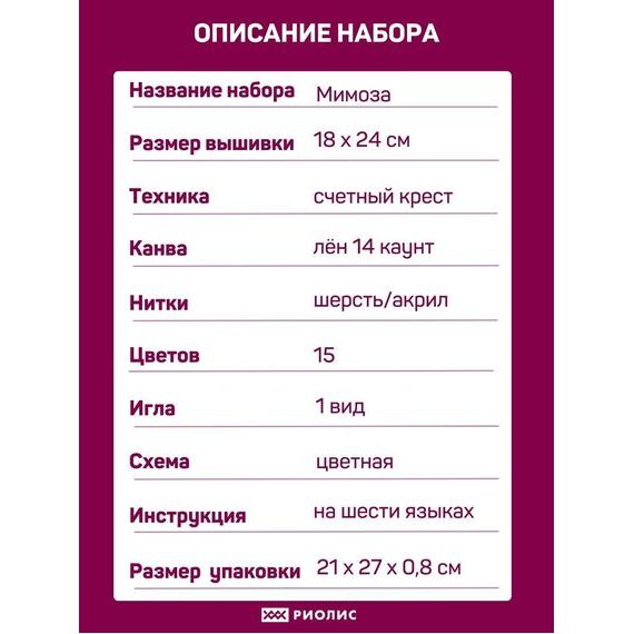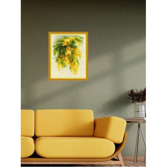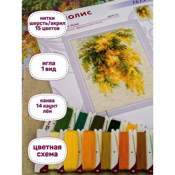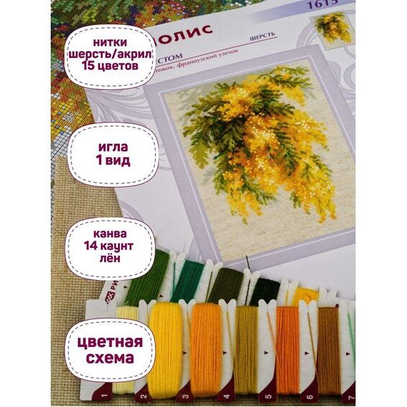 В наборе для вышивки крестом 'Мимоза' используются шерстяные мулине – они позволяют плотно зашивать сетчатую канву Aida 14, стежки получаются матовыми, достаточно объемными. Следуйте инструкции, выкладывайте равномерные стежки, и постепенно из-под вашей иглы начнет 'проступать' картина со сложной гаммой, плавными цветовыми переходами.