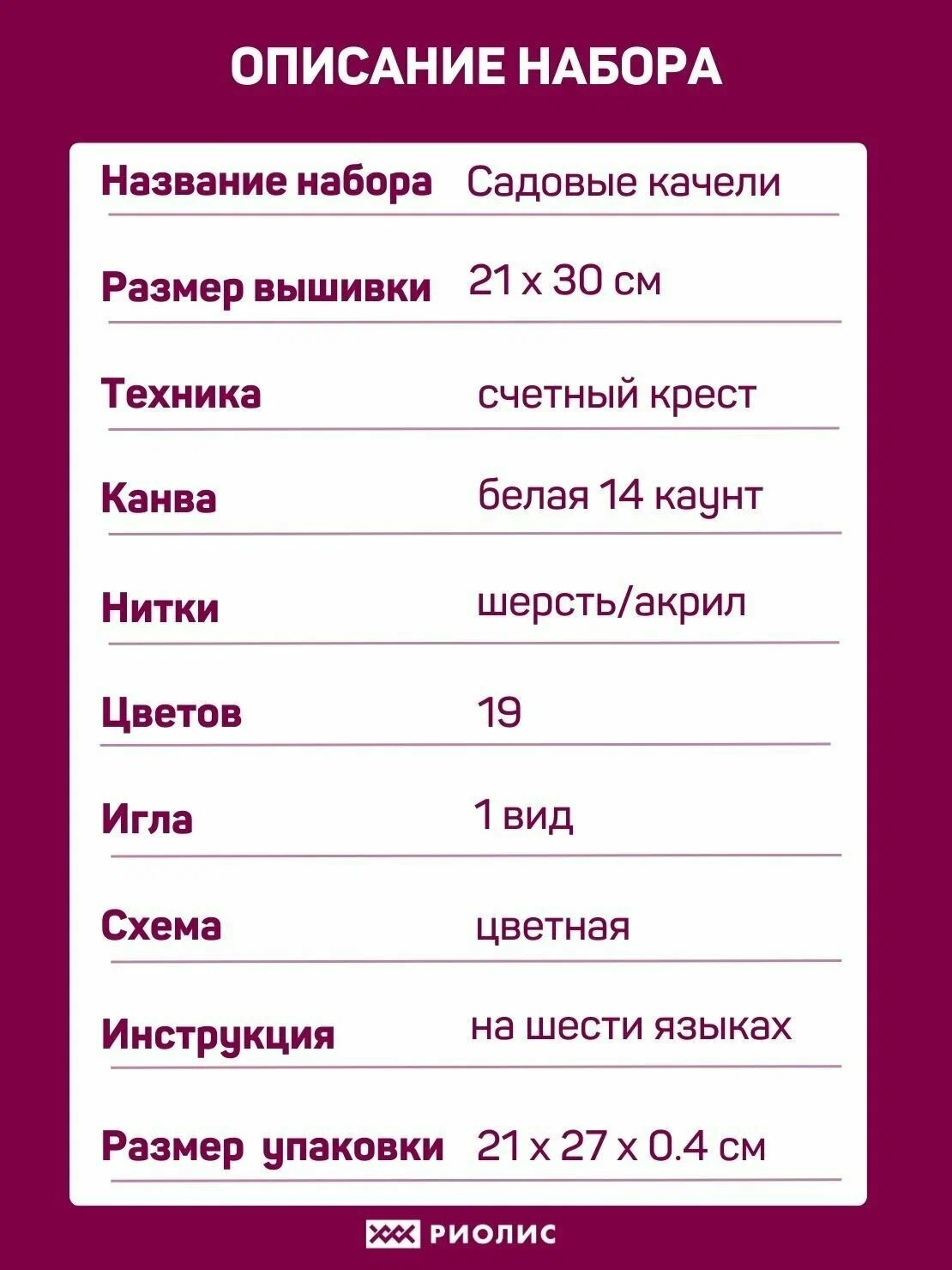 Продажа от производителя! В наборе для вышивания крестом "Садовые качелии" используются техники: счётный крест, полукрест, стежок, смешанные цвета. В наборы Риолис входит все необходимое для творческого процесса. Мы комплектуем наборы с запасом ниток в 20% от необходимого количества каждого цвета. Благодаря нашим наборам творчество доступно каждому! Просто выберите дизайн по душе и становитесь его создателем. Размер готовой работы: 21х30 см. В набор входит: цветная символьная схема, канва для вышивания без нанесенного рисунка 14 белая, нитки шерсть/акрил (19 цветов) на плашке(ах), игла.