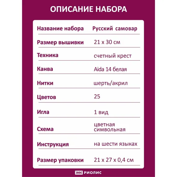 Riolis Набор для вышивания крестом 21х30см 2147 Русский самовар