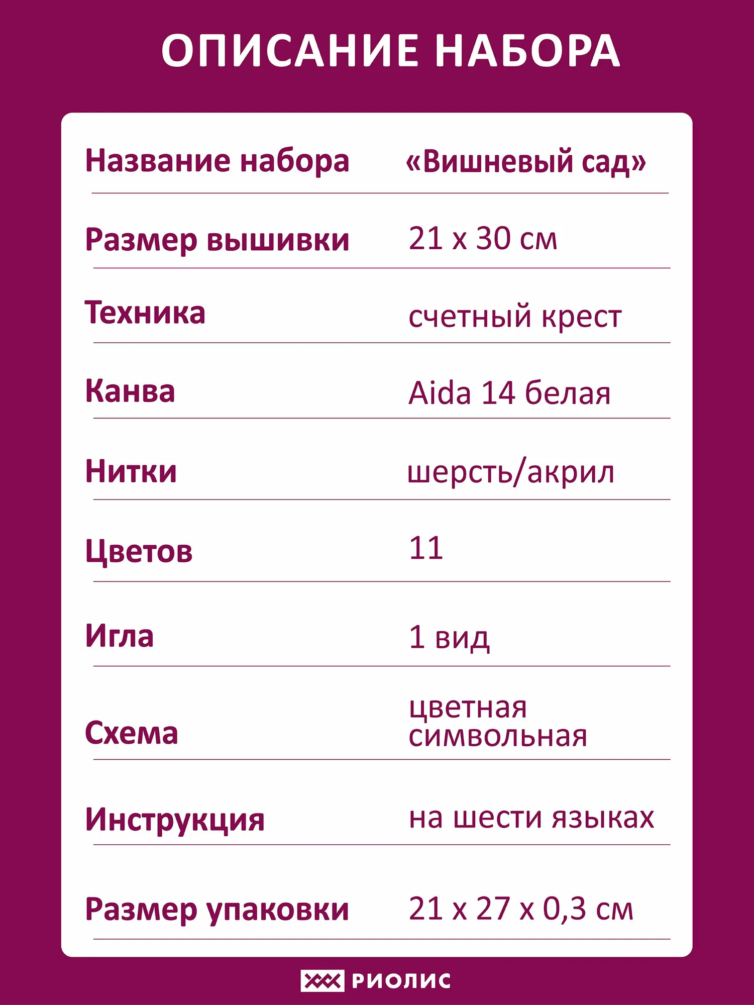Продажа от производителя! В состав набора «Вишневый сад» входит канва белая без нанесённого рисунка 14 каунта, нити шерсть/акрил 11 оттенков, а также простая для понимания цветная символьная схема и качественная игла для вышивки. Габариты готовой работы 21*30 см. Используется техника крест, полукрест, стежок. Благодаря подробной схеме и приложенной инструкции работа с лёгкой и приятной! Теплая летняя пора и яркая сочная вишня, пушистый котик занял местечко на стремянке и внимательно наблюдает за сбором урожая. Подарите себе приятные моменты с новинкой от Риолис «Вишневый сад». Набор подходит для праздничных поводов, таких как День рождения, Пасха, Восьмое марта. Оформленная картина послужит прекрасным презентом для мамы или бабушки. Продукция бренда риолис - оптимальное решение для тех, кто ищет изделие высокого качества, любит творчество и хочет попробовать себя. В нашем ассортименте найдутся варианты на любой вкус, как для опытных искусниц, так и для начинающих вышивальщиц, для детей и взрослых. От маленьких уникальных сюжетов до больших картин и репродукций. Риолис - ваш идеальный выбор!