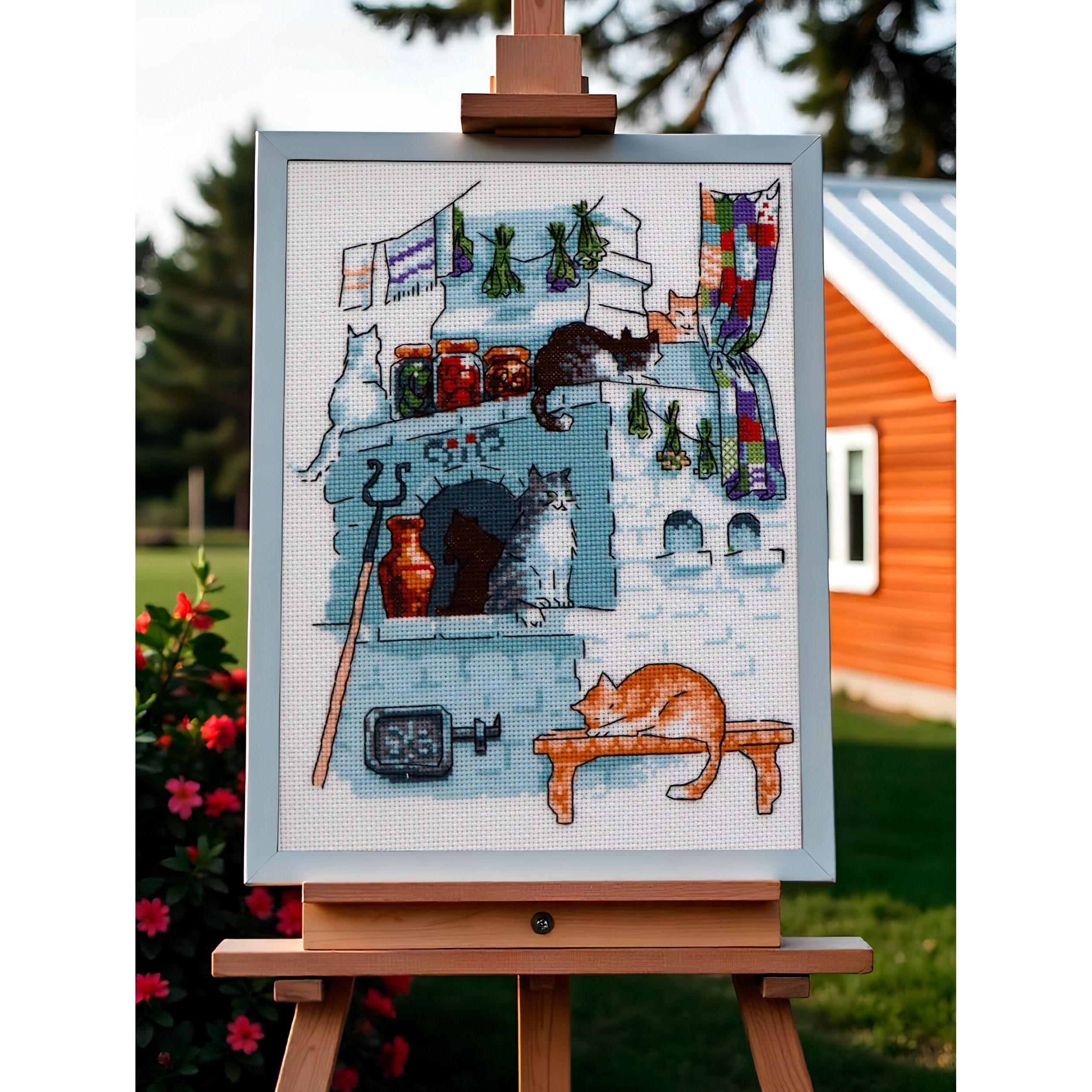 Вы сможете создать уникальное и неповторимое украшение комнаты, которое будет напоминать о ваших талантах и ручной работе. Вышивка крестиком - прекрасный подарок маме, бабушке, сестре, подруге на Новый Год, день рождения, новоселье и 8 марта. Вышивка оживляет тёплую и уютную сцену из домашней жизни, где несколько котов мирно расположились на старинной русской печи. Каждый кот изображён с любовью к деталям: выразительные мордочки и расслабленные позы создают ощущение покоя и безопасности.