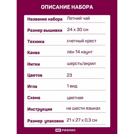 В наборе для вышивания крестом "Летний чай" используются техники: счётный крест, полукрест, стежок, смешанные цвета. В наборы Риолис входит все необходимое для творческого процесса. Мы комплектуем наборы с запасом ниток в 20% от необходимого количества каждого цвета. Благодаря нашим наборам творчество доступно каждому! Просто выберите дизайн по душе и становитесь его создателем. Размер готовой работы: 24х30 см. В набор входит: цветная символьная схема, канва для вышивания без нанесенного рисунка 14 хлопок/лен, нитки шерсть/акрил (23 цвета) на плашке(ах), игла, инструкция.