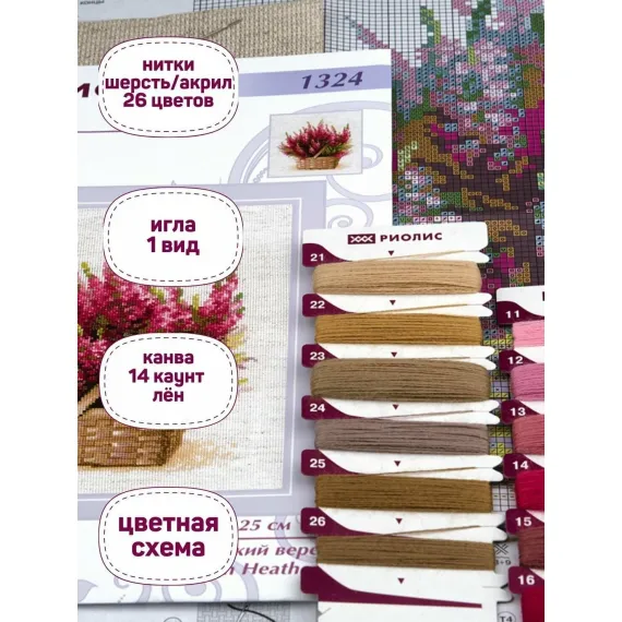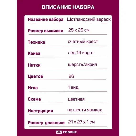 В наборе для вышивания крестом "Шотландский вереск" используются техники: счётный крест, полукрест, стежок. В наборы Риолис входит все необходимое для творческого процесса. Мы комплектуем наборы с запасом ниток в 20% от необходимого количества каждого цвета. Благодаря нашим наборам творчество доступно каждому! Просто выберите дизайн по душе и становитесь его создателем. Размер готовой работы 25х25см. Комплектация: подробная инструкция, цветная символьная схема, канва для вышивания без нанесенного рисунка Aida хлопок/лен, нитки шерсть/акрил (26 цветов) на плашке(ах), игла.