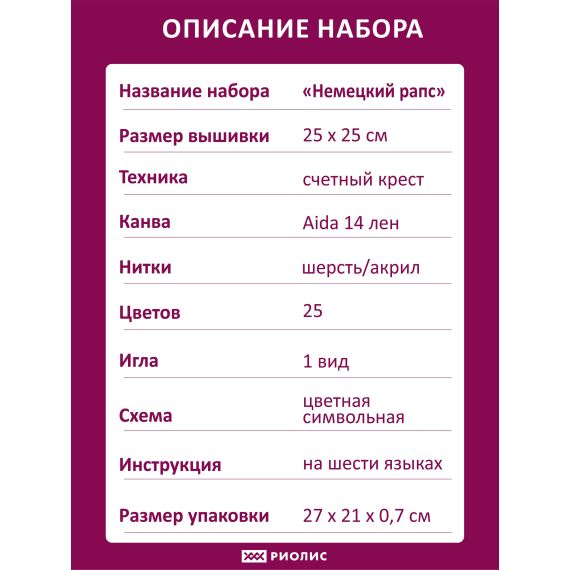 Набор для вышивания счетным крестом Риолис Немецкий рапс 25*25 см - это превосходный выбор для тех, кто ценит творчество, рукоделие и хобби. Отлично подходит как для начинающих, так и для опытных вышивальщиц. Вышивка картины своими руками - увлекательное занятие и прекрасный способ расслабиться и отдохнуть.
