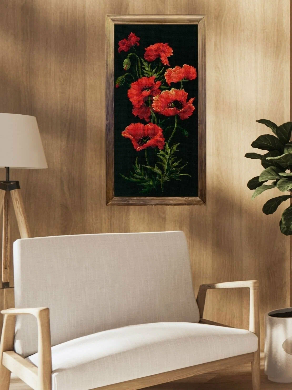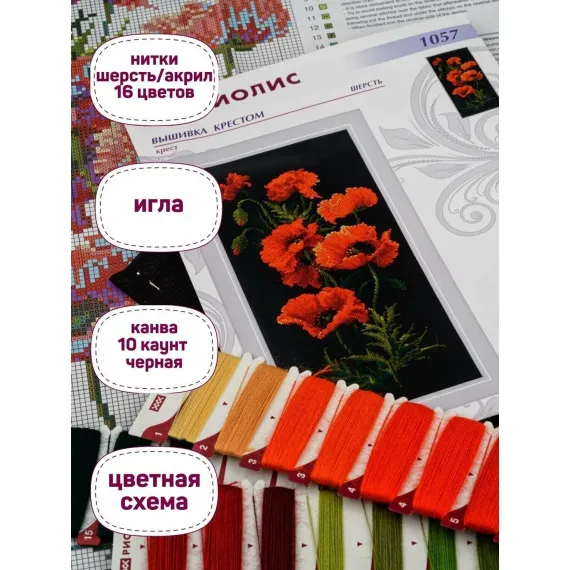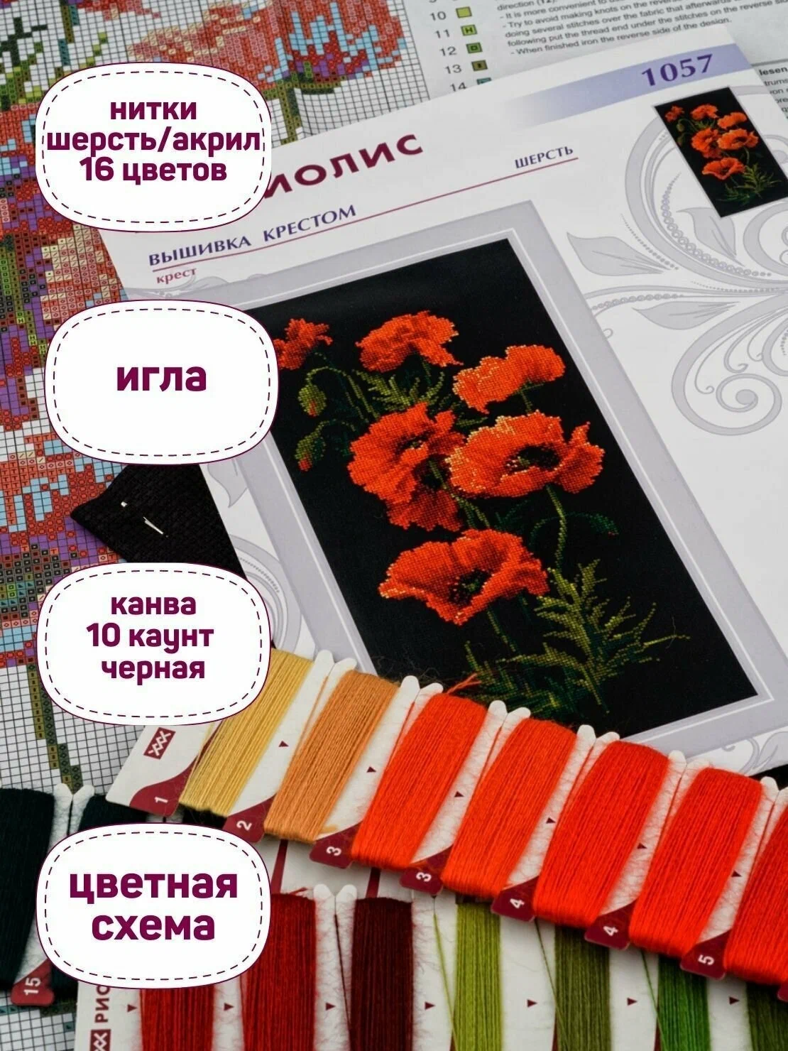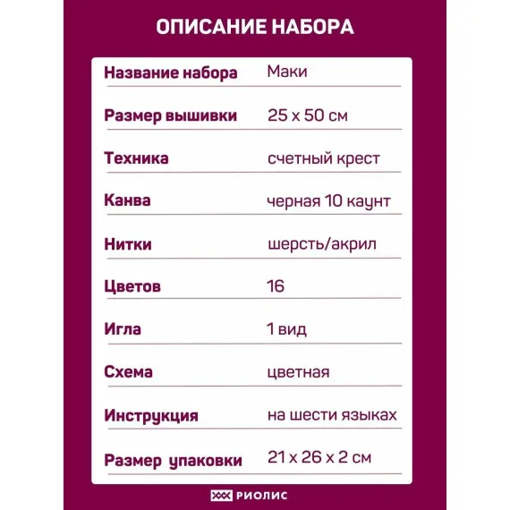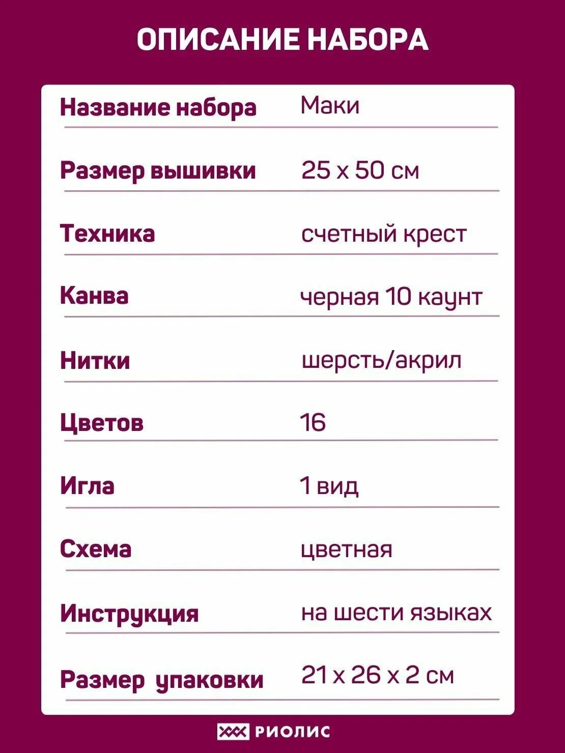 В наборе для вышивания крестом "Маки" используются техники: счетный крест. В наборы Риолис входит все необходимое для творческого процесса. Мы комплектуем наборы с запасом ниток в 20% от необходимого количества каждого цвета. Благодаря нашим наборам творчество доступно каждому! Просто выберите дизайн по душе и становитесь его создателем. Размер готовой работы: 25х50. Комплектация: цветная символьная схема, канва для вышивания без нанесенного рисунка Aida 10 черная, нитки шерсть/акрил (16 цветов) на плашке(ах), игла.