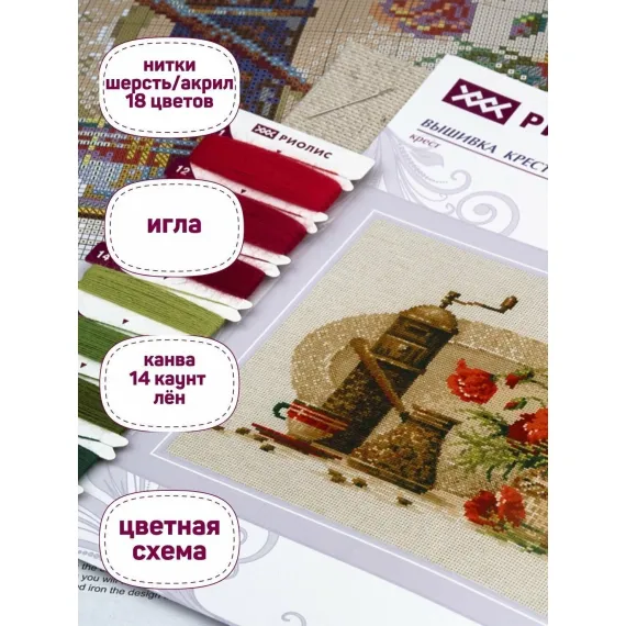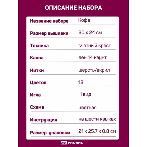В наборе для вышивания крестом "Кофе" используются техники: счётный крест. В наборы Риолис входит все необходимое для творческого процесса. Мы комплектуем наборы с запасом ниток в 20% от необходимого количества каждого цвета. Благодаря нашим наборам творчество доступно каждому! Просто выберите дизайн по душе и становитесь его создателем. Размер готовой работы: 30*24 см. Комплектация: канва для вышивания без нанесенного рисунка 14 хлопок/лен, нитки шерсть/акрил 18 цветов на плашке(ах), понятная цветная символьная схема, игла, инструкция.