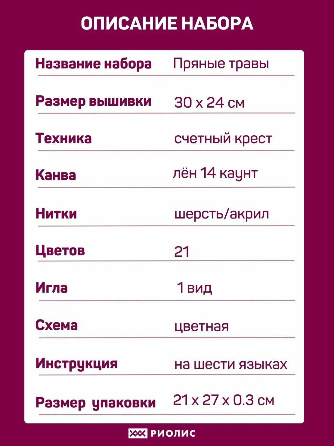 В наборе для вышивания крестом "Пряные травы" используются техники: счётный крест, полукрест, стежок, французский узелок. В наборы Риолис входит все необходимое для творческого процесса. Мы комплектуем наборы с запасом ниток в 20% от необходимого количества каждого цвета. Благодаря нашим наборам для вышивки творчество доступно каждому! Просто выберите дизайн по душе и становитесь его создателем. Размер готовой работы: 30х24 см. Комплектация: канва для вышивания без нанесённого рисунка 14 хлопок/лен, нитки мулине шерсть/акрил 21 цвет на плашке(ах), цветная символьная схема, игла.