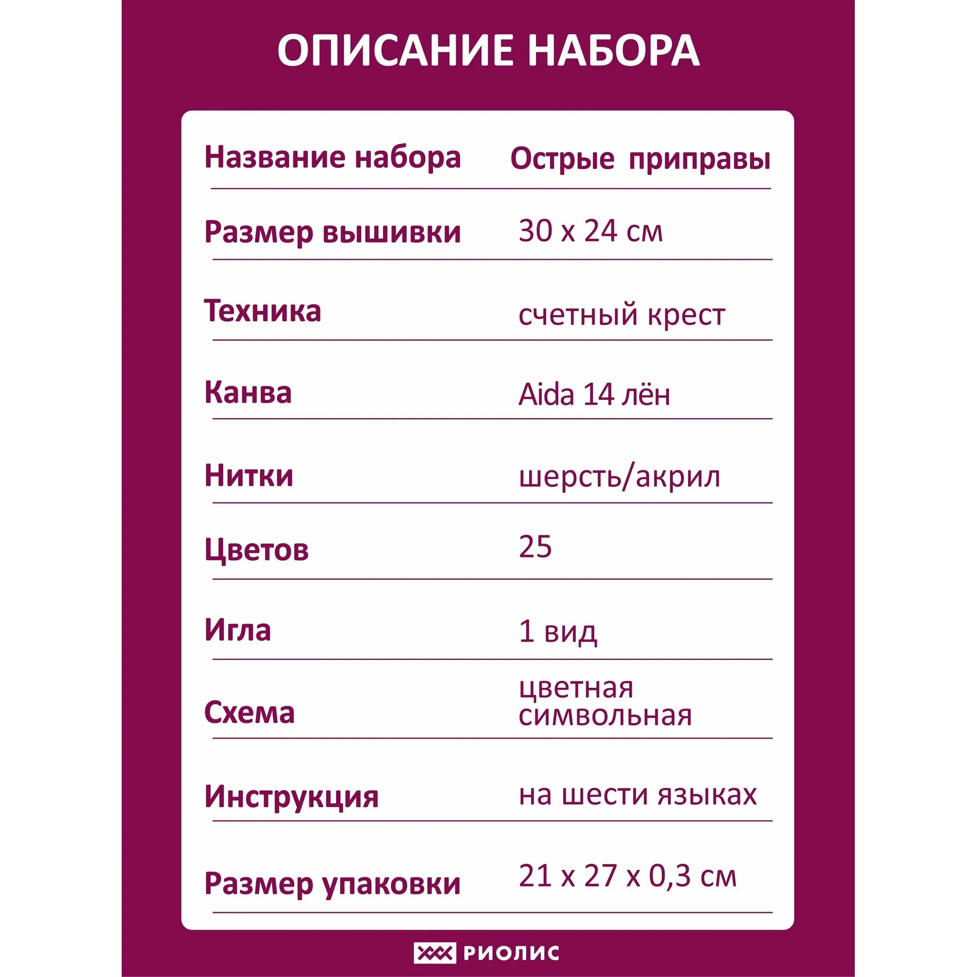 В наборе для вышивания крестом "Острые приправы" используются техники: счетный крест, полукрест, стежок. В наборы Риолис входит все необходимое для творческого процесса. Мы комплектуем наборы с запасом ниток в 20% от необходимого количества каждого цвета. Благодаря нашим наборам творчество доступно каждому! Просто выберите дизайн по душе и становитесь его создателем. Размер готовой работы: 30х24 см. В набор входит: канва для вышивания без нанесённого рисунка 14 лен/хлопок, нитки шерсть/акрил 25 цветов на плашке(ах), простая для понимания цветная символьная схема, игла, инструкция.
