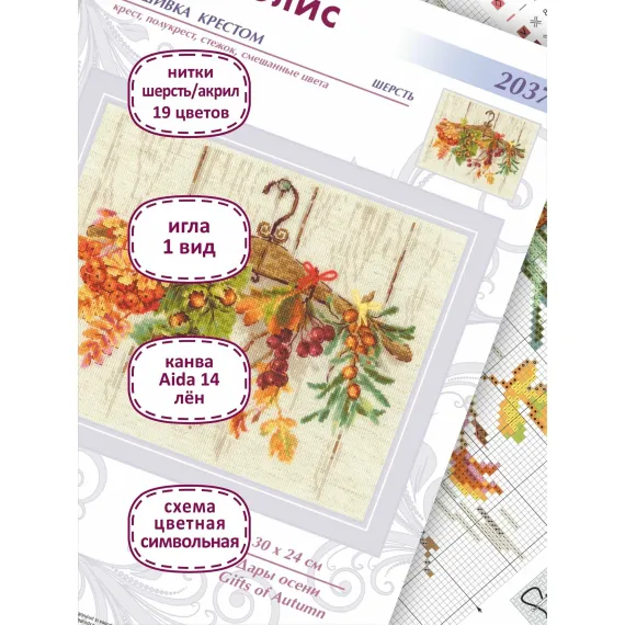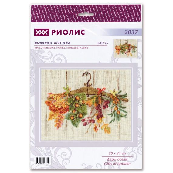В наборе "Дары осени" используются техники: счетный крест, полукрест, стежок, смешанные цвета. В наборы Риолис входит все необходимое для творческого процесса. Мы комплектуем наборы с запасом ниток в 20% от необходимого количества каждого цвета. Благодаря нашим наборам творчество доступно каждому! Просто выберите дизайн по душе и становитесь его создателем. Размер готовой работы: 30х24 см. В набор входит: цветная символьная схема, электронная схема, канва для вышивания без нанесенного рисунка Aida 14 льняная, нитки шерсть/акрил (19 цветов) на плашке(ах), игла.