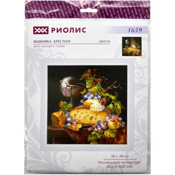 В наборе для вышивания крестом "Голландский натюрморт" используются техники: счётный крест, полукрест, стежок. В наборы Риолис входит все необходимое для творческого процесса. Мы комплектуем наборы с запасом ниток в 20% от необходимого количества каждого цвета. Благодаря нашим наборам творчество доступно каждому! Просто выберите дизайн по душе и становитесь его создателем. Размер готовой работы: 30х30 см. В набор входит: цветная символьная схема, канва для вышивания без нанесенного рисунка Aida 14 черная, нитки шерсть/акрил (31 цвет) на плашке(ах), игла, инструкция.
